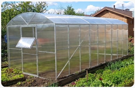 Стенки теплицы из поликарбоната удерживают внутри влагу, необходимую для овощей. А благодаря системе автоинтеллект внутри теплицы поддерживается оптимальный микроклимат.